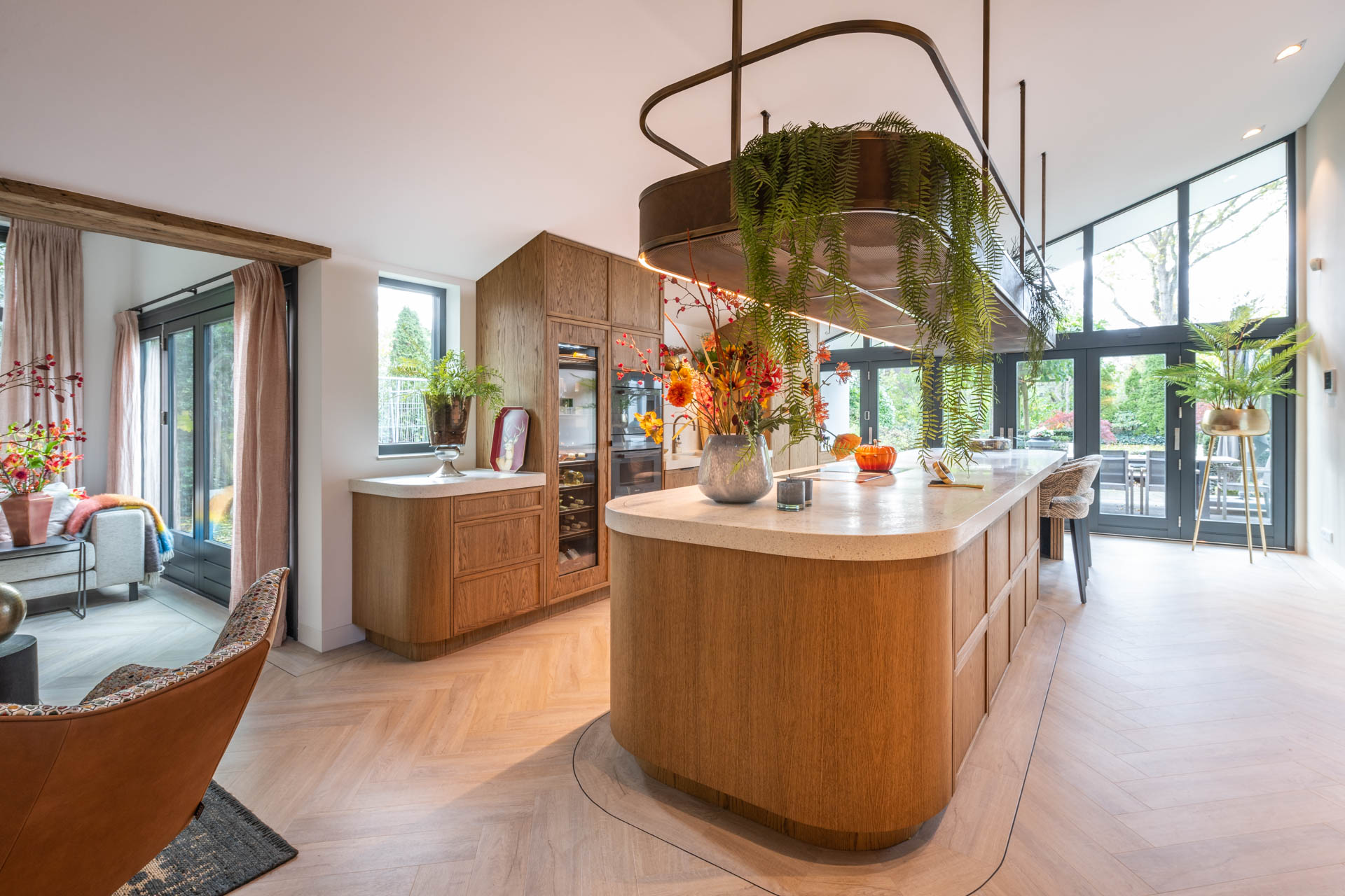 “De koffiehoek met Piet Boon visgraattegels versterkt de elegantie en het praktische van de ruimte.”