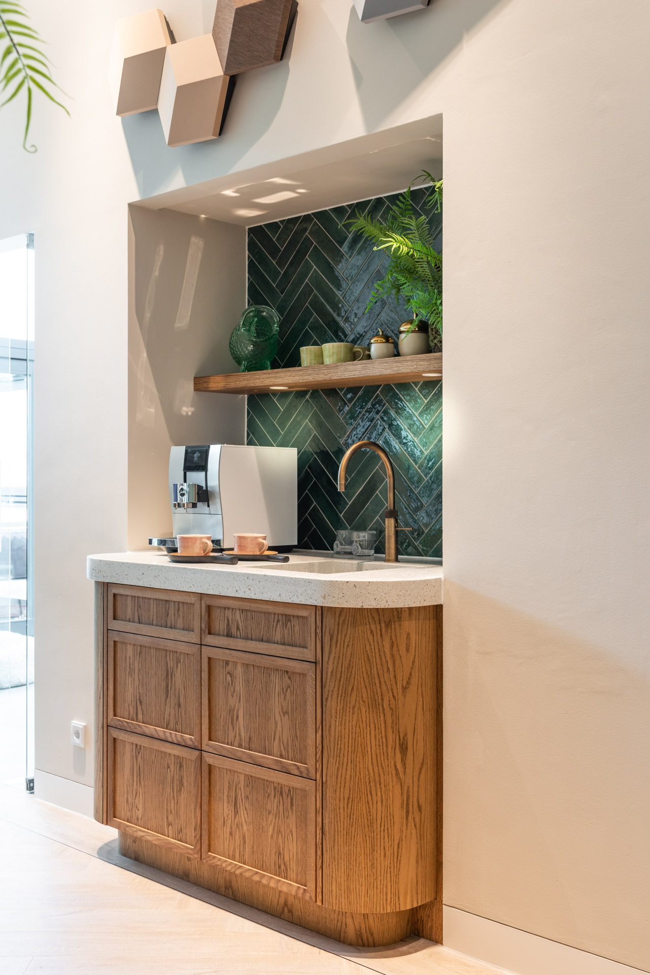 De koffiehoek is meer dan alleen functioneel. De Piet Boon visgraattegels geven het hoekje karakter, zonder dat het te druk wordt. Het voelt als een mini-oase in de keuken: perfect om even te pauzeren of de dag te beginnen.