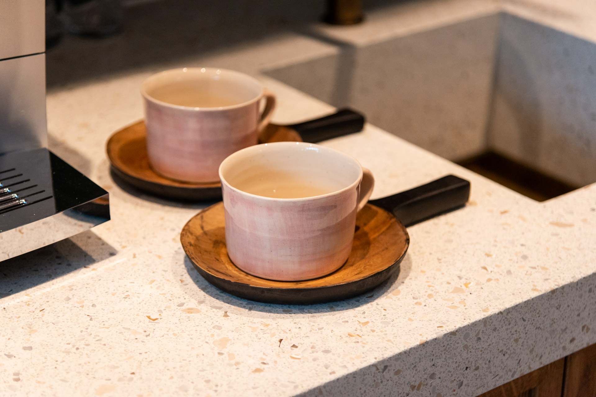 Zeker. Terrazzo is sterk, slijtvast en bestand tegen hitte. In dit ontwerp is gekozen voor een blad uit één stuk, wat niet alleen mooi oogt, maar ook praktisch is: geen naden, dus makkelijker schoon te houden en ideaal voor intensief gebruik.