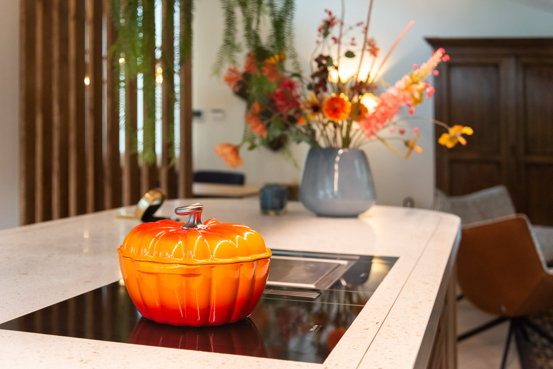 Het terrazzo werkblad is het middelpunt van de keuken. Gemaakt uit één stuk, dus langere lengtes zijn geen probleem. Met een ingelegde messing rand voor die luxe, verfijnde uitstraling. Het blad heeft een dynamisch effect, maar de rustige kleur houdt de ruimte in balans. Het werkblad is stevig en perfect voor een 5 meter lang eiland om heerlijk aan te kunnen koken en borrelen. Het is een keuken die echt draait om samenkomen.