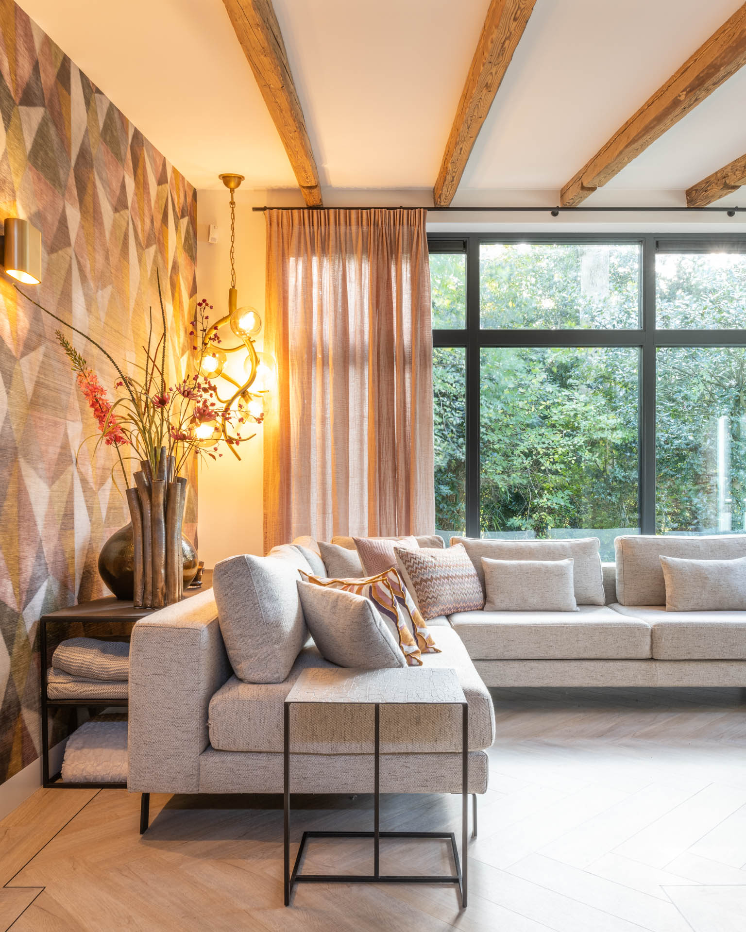 Dat dachten we eerst ook, maar met een goede bevestiging en slimme plaatsing is het juist een meerwaarde. Het brass plafondrek trekt de ruimte optisch omhoog en brengt warmte én licht zonder te overheersen.