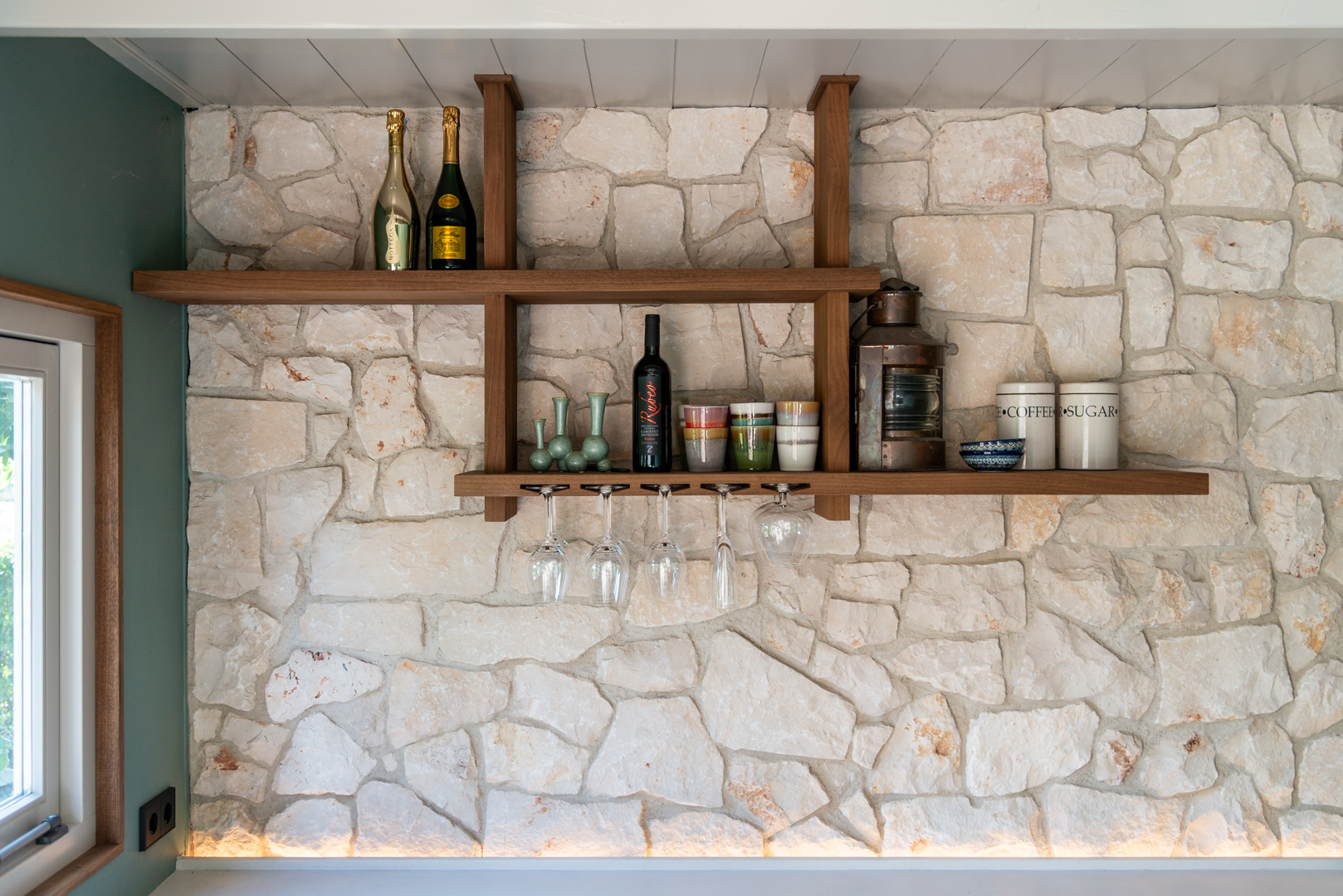 De wand, afgewerkt met natuurlijke flagstones, geeft de ruimte een warme, mediterrane charme en een tijdloze, authentieke uitstraling.