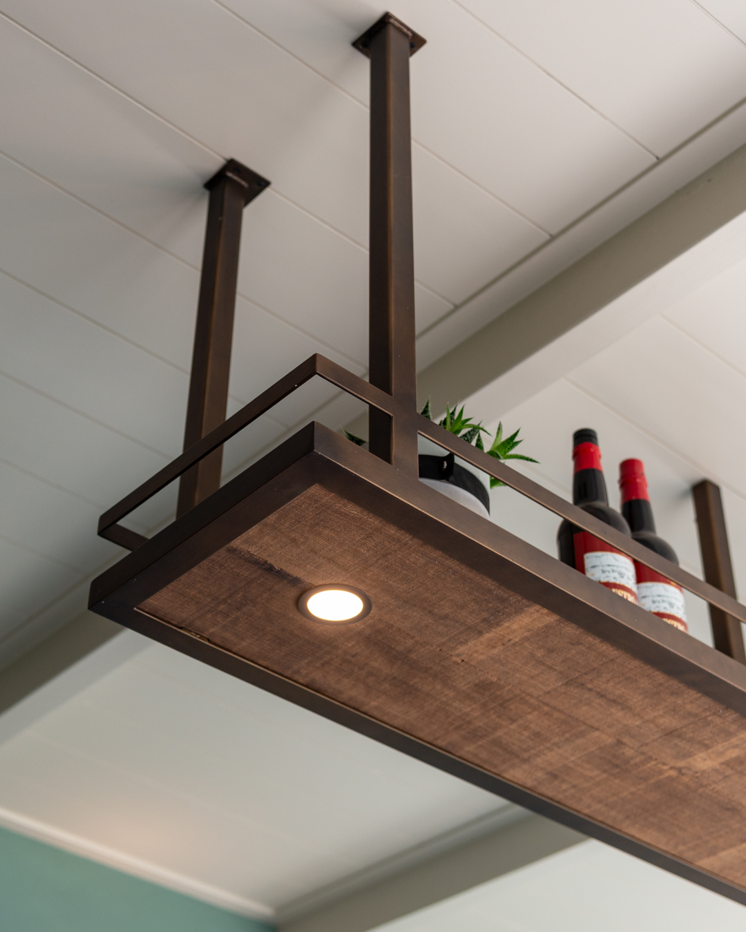 Dé eyecatcher is de maatwerk keuken met bar. De werkbladen van beton ciré combineren prachtig met het grove Fraké-hout van de keuken en de flagstones erboven. “Het plafondrek maakte Boudewijn van messing, wat ook terugkomt in de spots en de Quooker Cube,die kokend, bruisend en gekoeld water geeft. En heb je die speelse wijnplank gezien?” Koelkasten, Kaelo-wijnkoelers en interieurstyling maken het helemaal af.